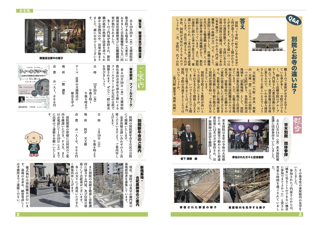 大阪教区(大阪・奈良・和歌山・兵庫一部)には五つの別院と一つの支院があり、各別院の周辺地域を「祟敬(そうきょう)地域」として、別院を地域の教化活動の拠点と位置付けています。ただ、広範な祟敬地域の教化活動は別院職員のみでは出来ず、祟敬寺院のご住職やそのご家族の協力無しには成り立ちません。祟敬寺院と共に地域に密着した教化活動に取り組む拠点として別院が役割を担い、ご本山をお支えしています。