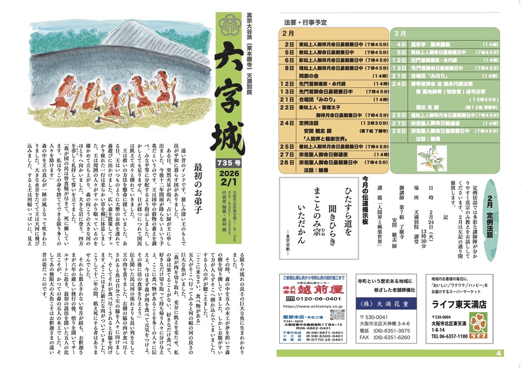 天満別院では、2月24日(火)13時30分より講堂にて定例法話が開催されます。