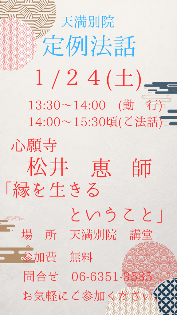 天満別院では、1月24日(土)13時30分より講堂にて定例法話が開催されます。