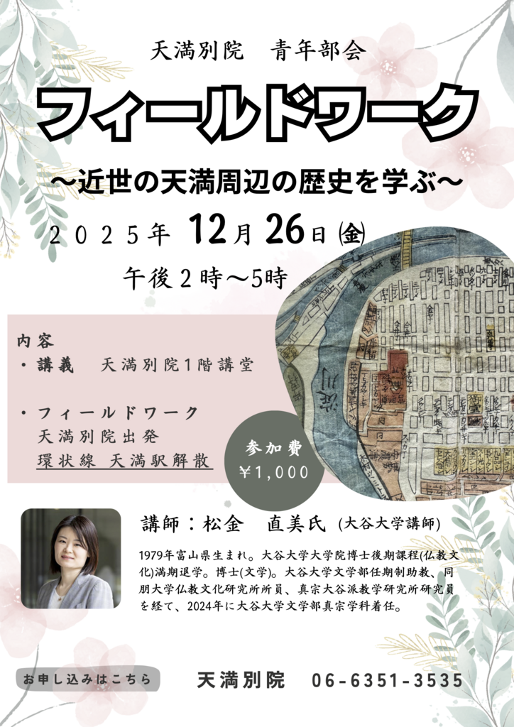 天満別院では、12月26日(金)14時から一階講堂にて青年部会主催フィールドワークが開催されます。